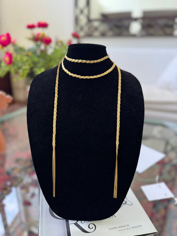 Gold-Plated Braided Lariat Necklace – A versatile elevation piece for your jewelry collection. This long braided chain can be styled in multiple ways: wrap it once or twice around your neck, knot the tails at the bottom, or let them dangle for an effortlessly chic look. Elegant and timeless, it’s the perfect piece to dress up everyday outfits or add sophistication to an evening look.