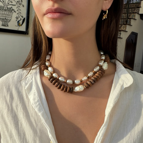 Elevate your everyday style with this modern twist on classic elegance. This necklace features genuine pearls, each beautifully separated by natural wood discs and rich brown glass beads for a warm, earthy contrast.